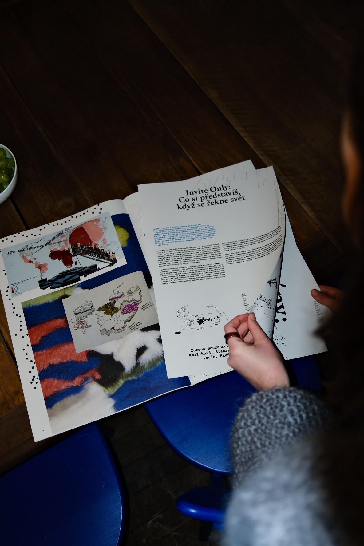 Grafické řešení je založené na omezené barevnosti, černé a světle modré. Modrá zde funguje symbolicky, odkazuje na chlad, klid i odstup, ale také jako barva chladného stínu a ticha. V kontrastu s černobílým zbytkem vytváří jemné, ale výrazné orientační body. Práce s typografií, měřítkem i rytmem sazby vychází z novinového formátu, ale vědomě jej narušuje. Texty se střídají s prázdnými plochami, ilustrace se objevují v druhém plánu grafiky a podporují pocit vrstvení, podobně jako ve scénografickém prostoru. Zin byl vytištěn na recyklovaný novinový papír, což ovlivnilo volbu barev a kontrastů i celkový charakter publikace. Materiálová skromnost se stala vědomou součástí konceptu, tiskovina působí dočasně, křehce a zároveň otevřeně, jako médium určené k listování, přehýbání a fyzickému kontaktu. Velký důraz byl kladen na efektivní práci s rozpočtem a jednoduchost produkce bez ztráty obsahové a vizuální kvality.